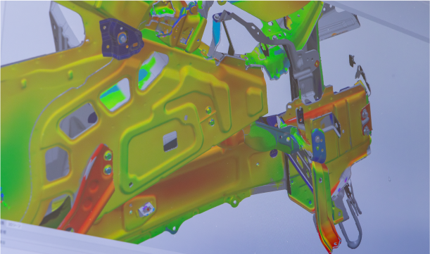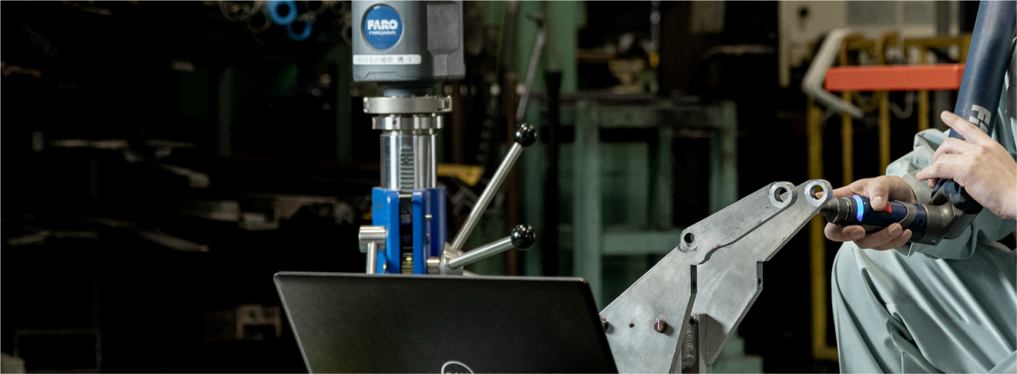 FARO社製の多関節式3次元測定機「Quantum X FaroArm®シリーズ」を保有。0.04mmの測定精度を持ちながら、自在な方向を向けられることに加え、コンパクトで持ち運びできることが特長です。お客様の生産現場へ持ち込み、狭いスペースに設置して使用できます。「ボディ部品の複雑な3次元曲面の精度が出ない」といった問題があれば、連続する各工程にてスキャニング。目視では判別できない曲面形状の誤差を数値化して、問題点をフィードバックすることが可能です。そこから設備の改修やセンサ・制御プログラム、ロボットティーチングなどの対応も当社なら一貫して対応できます。当社では測定機を2018年に導入し、治具の精度調整を皮切りにこれまで様々なシーンで活用してきました。