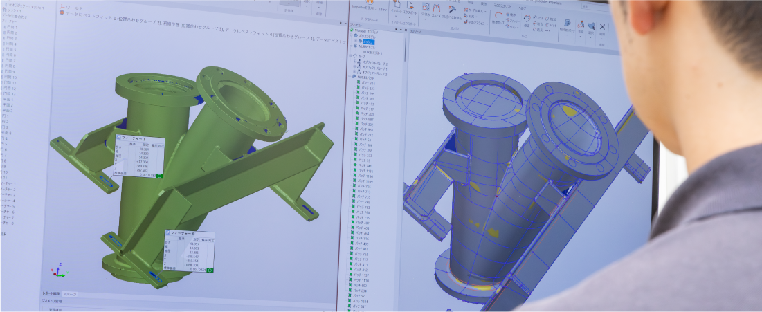 スキャンデータは製品精度の比較だけに留まりません。そこからのデータ処理により、設計工程などに転用可能な3Dモデルへと変化します。「図面がないけど、もう一回同じものを作りたい」「製作してから、現地で改造してしまった」「既存の装置に組み込みたいけど、検証が難しい」。こんなご相談にお答えできるのがリバースエンジニアリングです。現地現物の情報を3Dモデルへ変換させることによって、あきらめていたことを実現可能にします。